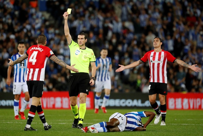 El árbitro Martínez Munuera muestra la segunda amarilla a Íñigo Martínez. Foto: EFE