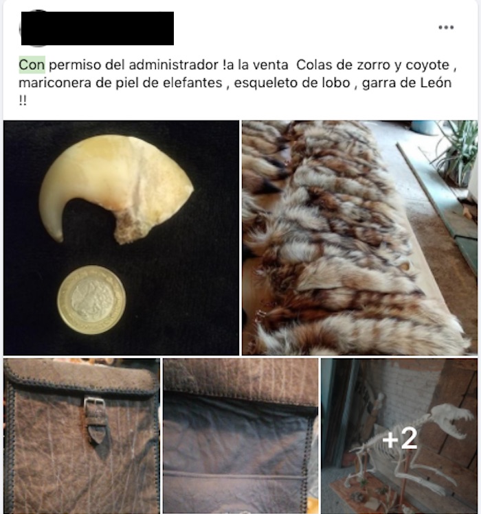 Otro caso que oscila entre la legalidad es una usuaria de Facebook que ofrece una garra de león, colas de zorro y coyote, o un esqueleto de lobo.
