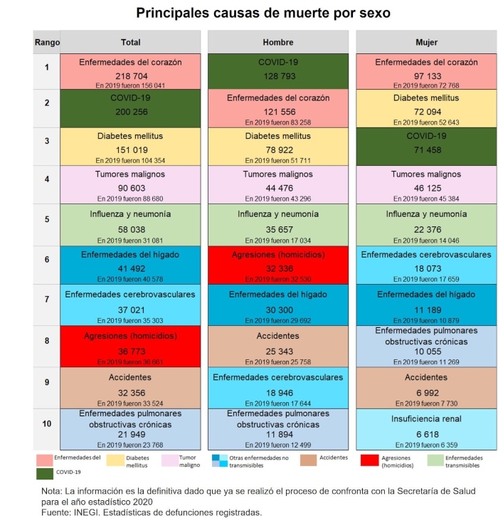 México registró durante 2020 un total de un millón 086 mil 743 defunciones, con lo que se registró un exceso de mortalidad en el país, de las cuales 218 mil 704 se debieron a enfermedades del corazón, 200 mil 256 a la COVID-19 y 151 mil 019 fueron muertes por diabetes mellitus.