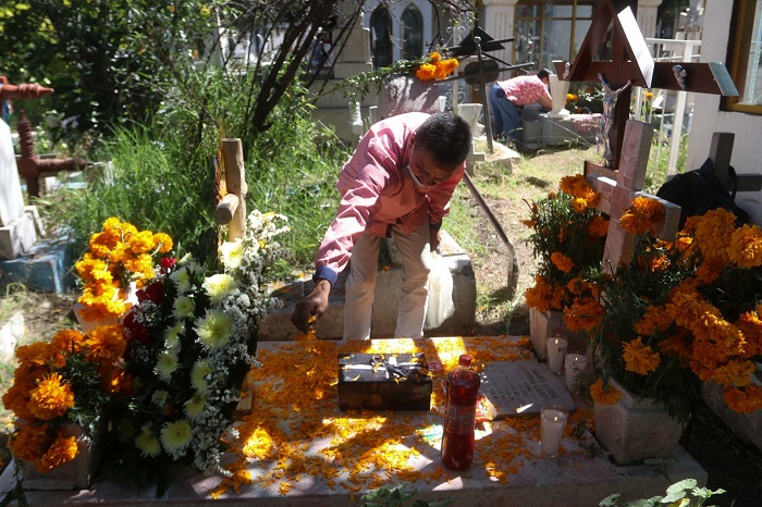 Las personas no dejan de visitar los panteones, ni de hacer caminitos con cempasúchil hacia los altares de las casas. Foto: Crisanta Espinosa, Cuartoscuro
