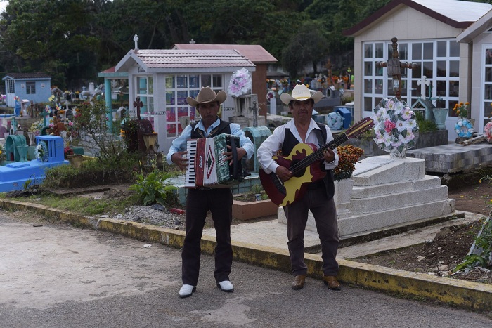 Las personas que acudan a los panteones también contratan a músicos para que interpreten las melodías que les gustaban a sus difuntos. Foto: Yerania Rolón, Cuartoscuro