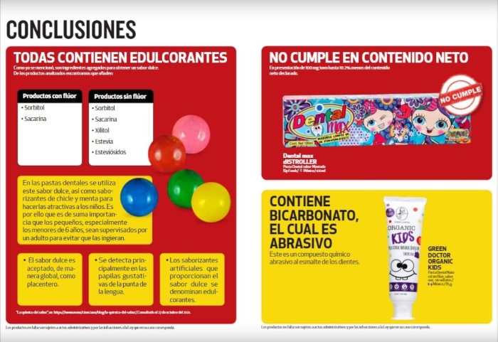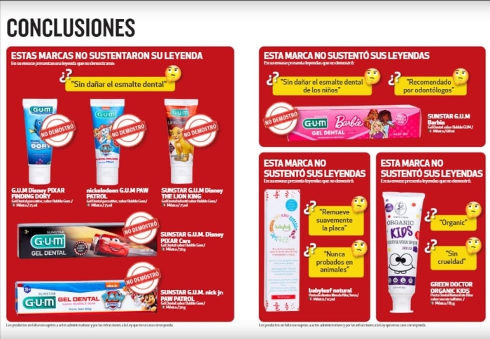 Además, la Procuraduría, a cargo de Ricardo Sheffield Padilla, demostró que al menos 17 de las 33 marcas no pudieron comprobar o sustentar sus leyendas, en las cuales prometen "no visitar más al dentista, proteger la placa dental, no dañar el esmalte dental de los infantes, no estar probados en animales, ser recomendados por odontólogos, ser orgánicas, o no ser abrasivas".