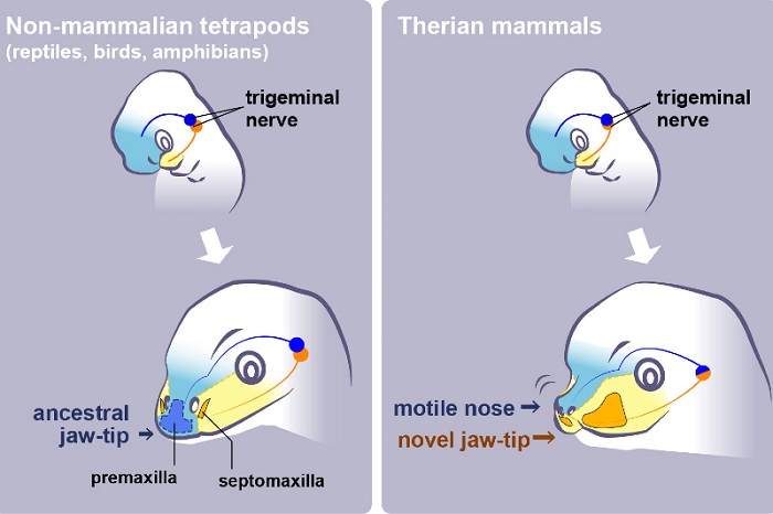 A medida que los ancestros de las especies acumulaban más diferencias físicas y genéticas, el hueso en la punta de la mandíbula superior de los reptiles, el premaxilar, se hizo más pequeño y migró hacia arriba y el hueso que estaba detrás, el septomaxila, se hizo más grande y avanzó para convertirse en la punta de la mandíbula en los mamíferos. Los investigadores dicen que los huesos faciales de los mamíferos que ponen huevos, como el ornitorrinco y el equidna australianos, proporcionan ejemplos vivos adicionales de estructuras óseas de transición desde el modelo de reptil evolutivamente más antiguo hasta la estructura de mamífero de evolución más reciente.