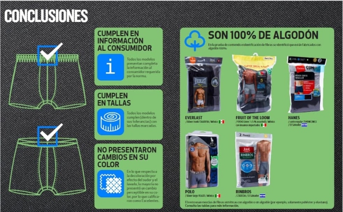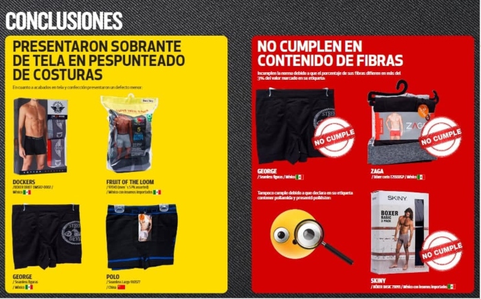 En las conclusiones de la investigación se dio a conocer que en el caso de las marcas Dockers -modelo Bóxer brief DMSR 2-0002- (México), Fruit of de loom -modelo 97043 pack de 5- (México), George -modelo Seamless figuras- (México) y Polo -modelo Seamless Largo 910577 (China) presentaron restantes de tela en el pespunteado de las costuras, sin embargo, éstos sólo constituyen defectos menores.