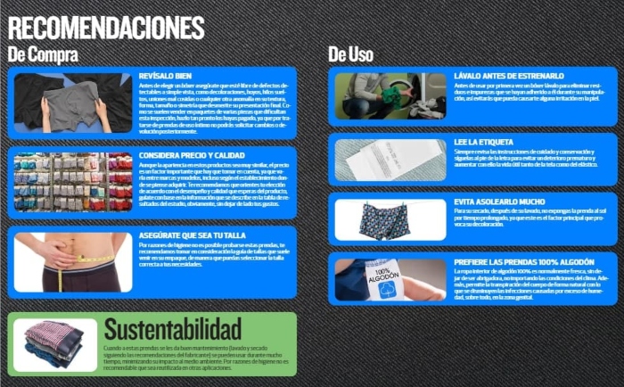 Finalmente, la dependencia sugirió a los compradores revisar bien las etiquetas de cuidado para hacer que las prendas duren el mayor tiempo posible. También recomendó lavar las prendas antes de usarlas, no asolearlas por mucho tiempo y elegir mayoritariamente prendas de algodón.