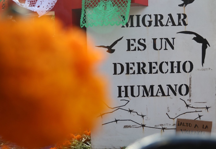 Integrantes de colectivos en defensa de los derechos humanos colocaron uba ofrenda en el antimonumento 72+ para Migrantes fallecidos durante su transito hacía otro país. Foto: Andrea Murcia, Cuartsocruo.