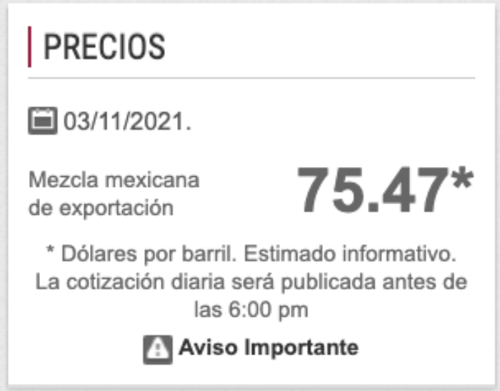 De acuerdo con los registros del portal de Petróleos Mexicanos (Pemex), al corte del 3 de noviembre el petroprecio de México quedó en 75.47 dólares, siendo que el cierre previo, del 2 de noviembre, había cerrado en 78.06 dólares.