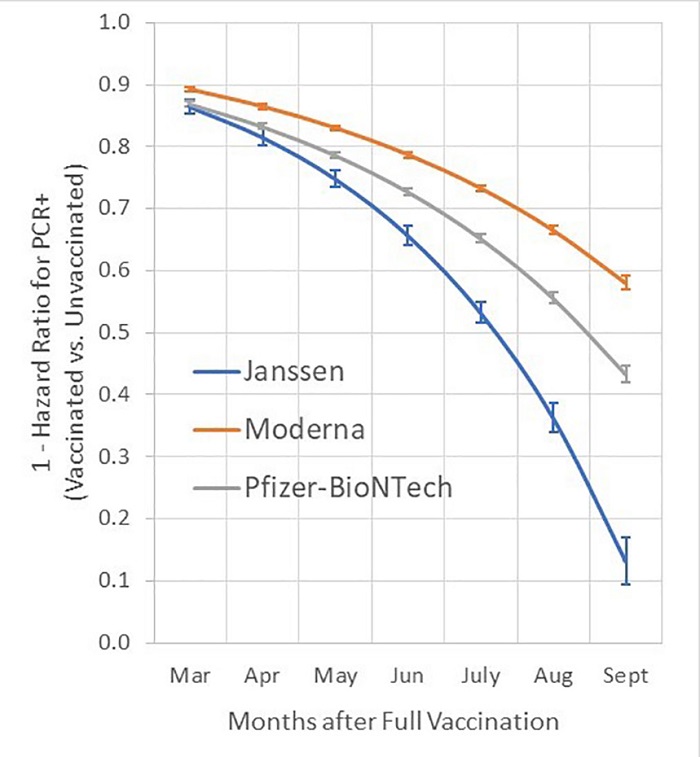 Si bien la eficacia de todas las vacunas contra la COVID disminuyen con el paso de los meses, este estudio reveló que, entre las de Pfizer, Moderna y Janssen, la última es la que más pierde con el tiempo.