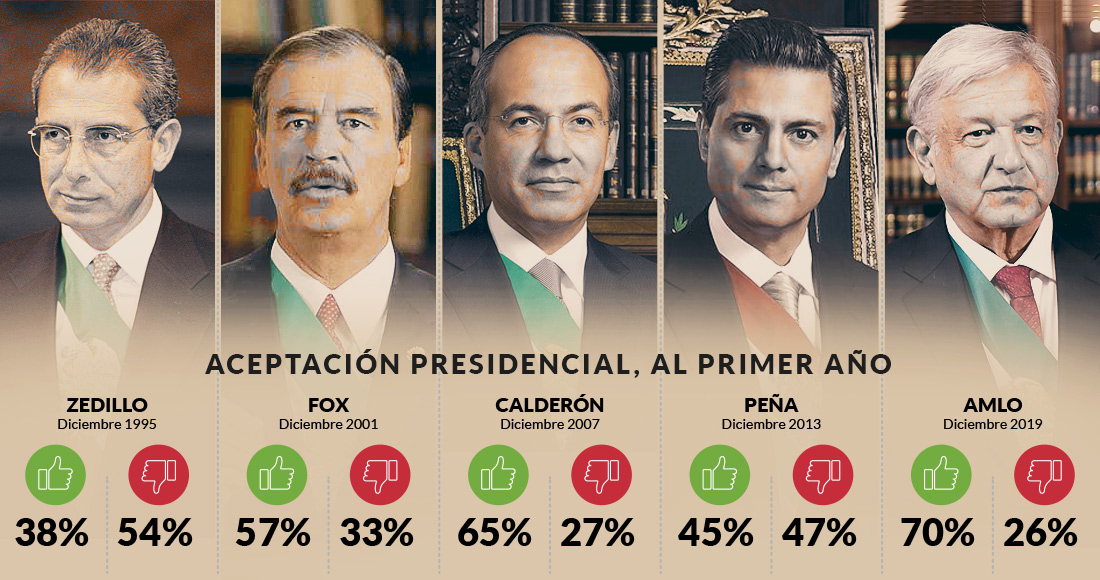 No obstante, las cifras más recientes del poll of polls que elabora Oraculus muestran que de cara a su tercer año de Gobierno, López Obrador promedia un 62 por ciento de popularidad, un nivel mayor al de Enrique Peña Nieto (34 por ciento), Felipe Calderón Hinojosa (61 por ciento), Vicente Fox Quesada (56 por ciento) y Ernesto Zedillo Ponce de León (58 por ciento).