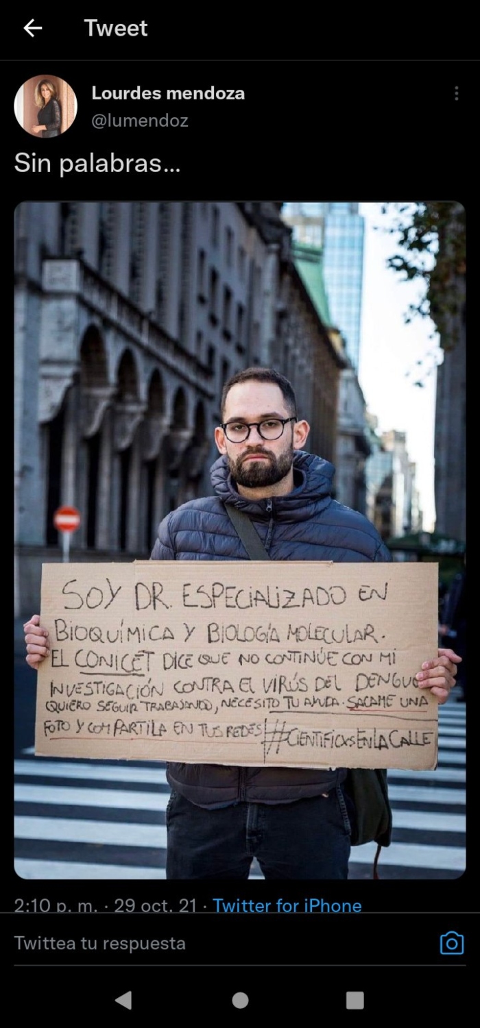 Una fotografía compartida en Twitter muestra a un hombre con barba sosteniendo un letrero que dice: “Soy Dr. especializado en bioquímica y biología molecular. El Conicet dice que no continúe con mi investigación contra el virus del dengue. Quiero seguir trabajando, necesito tu ayuda. Sacame una foto y compartila en tus redes. #cientificxsenlacalle”.