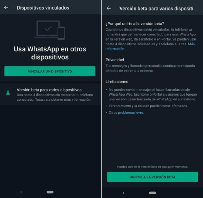 La plataforma ha extendido la opción multidispositivo a todos los usuarios a través de la opción de "Dispositivos vinculados", que ofrece la versión beta para varios dispositivos (un total de cuatro, móvil aparte) sin tener que permanecer conectado a Internet o tener el móvil encendido.