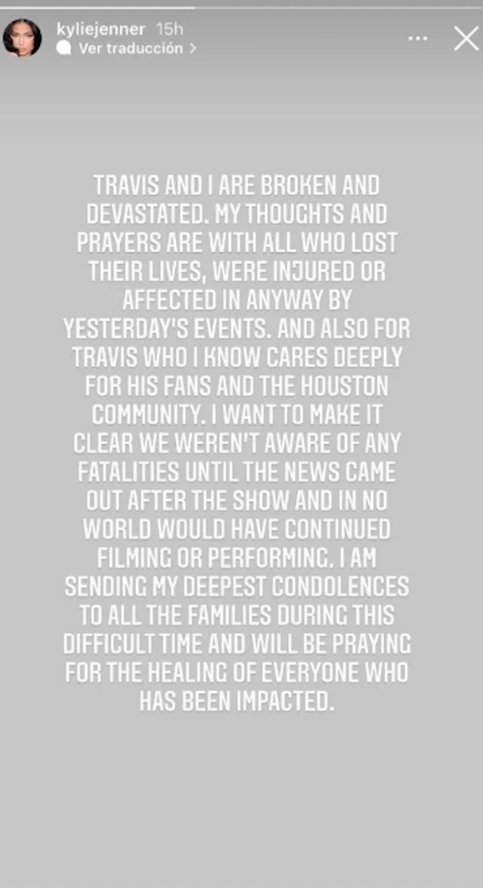 "Travis y yo estamos destrozados y devastados. Mis pensamientos y oraciones están con todos los que perdieron la vida o resultaron heridos o afectados de alguna manera por los eventos de ayer. También para Travis, pues sé que se preocupa profundamente por sus fanáticos y la comunidad de Houston", comunicó este domingo a través de una publicación en sus historias en Instagram.