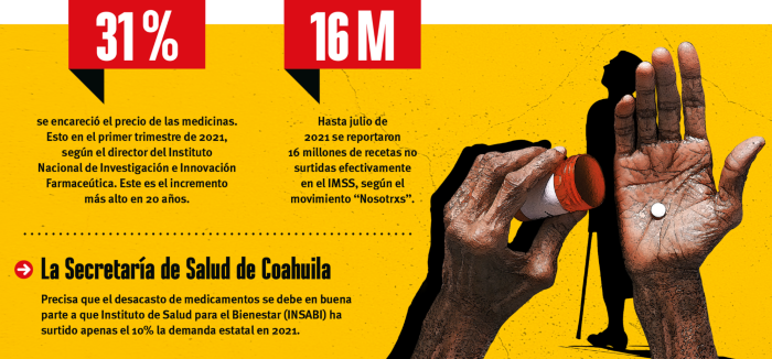 Tan sólo en julio de este año, la iniciativa ciudadana “Cero desabasto”, de la organización “Nosotrxs”, colocó a Coahuila en el quinto lugar a nivel nacional con mayor desabasto de medicamentos, en el reporte del primer cuatrimestre del año.