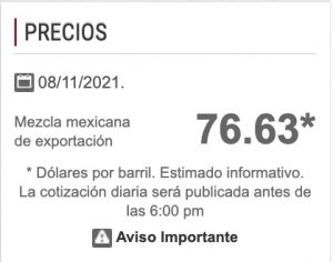 El 4 de noviembre no se publicó el precio de la mezcla mexicana de exportación debido a que hubo falta de cotización por el feriado de Deepavali de Singapur. Sin embargo, el precio precio bajó alrededor de dos dólares al cierre de su última sesión.