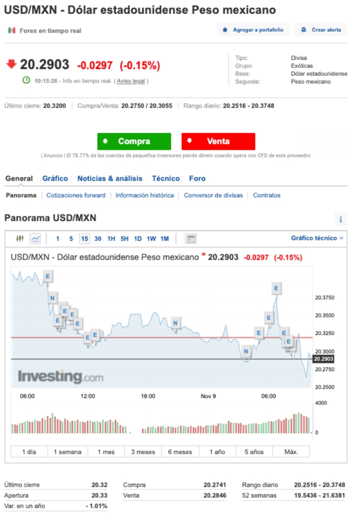 La sesión marca la tercera consecutiva de ganancias para el peso frente al dólar, con lo que acumula una ganancia de 23.31 centavos en las tres sesiones. Foto: Captura de pantalla, portal de Investing.