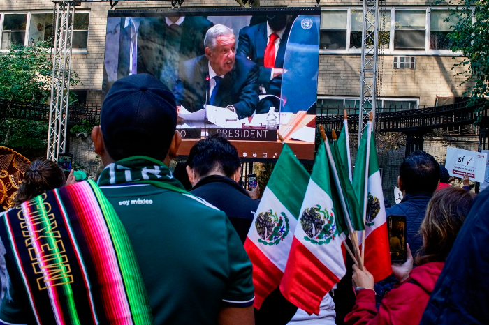Afuera de la reunión de AMLO en la ONU, los migrantes miraban el discurso en una pantalla, y portaban consigo pancartas que decían "muy bien dicho, Presidente, no puede haber Gobierno rico con pueblo pobre", banderas y demás, mientras gritaban y aplaudían al escuchar hablar al Presidente.