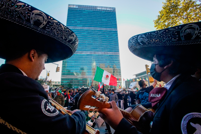 Partidarios del presidente de México Andrés Manuel López Obrador bailan y cantan la música de mariachis frente a la sede de la ONU. Foto: AP