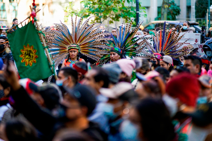 Partidarios del presidente de México, Andrés Manuel López Obrador, le escuchan a través de una pantalla en Nueva York, frente a Naciones Unidas, mientras éste habla ante el Consejo de Seguridad de la ONU el martes 9 de noviembre del 2021. Foto: AP