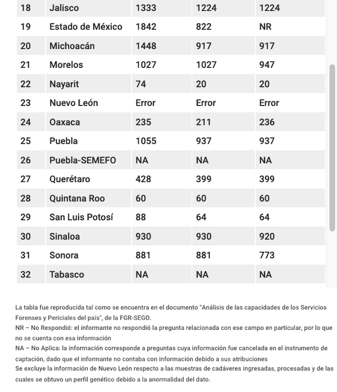 Respecto a la identificación de cuerpos o restos humanos localizados en fosas clandestinas, el diagnóstico indica que Guerrero, Chihuahua, Tamaulipas, Sinaloa, Veracruz, Zacatecas y Nuevo León fueron las siete entidades que identificaron un número mayor de personas. Pero en el caso de Guerrero no hubo respuesta siquiera sobre cuántos cuerpos fueron exhumados de fosas clandestinas y Nuevo León tenía pendiente de identificar a casi un millón de fragmentos humanos.