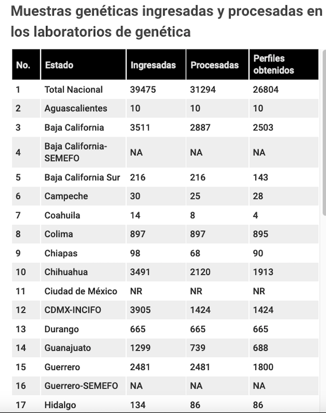 El documento también hace evidente la falta de capacidades para analizar y obtener perfiles genéticos: de las 39 mil 475 muestras que se tomaron hasta el 28 de febrero de 2019, sólo se había procesado el 79 por ciento y se había obtenido un perfil genético en el 68 por ciento de casos. Los estados que obtienen un porcentaje más bajo de perfiles, respecto a la cantidad de muestras, son Estado de México (45 por ciento), Guanajuato y Coahuila con 57 por ciento, y Nayarit con 27 por ciento. Tlaxcala y Yucatán no reportaron ninguna muestra genética por procesar.