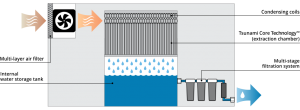 El aire se extrae a través de una serie de bobinas de condensación donde el vapor de agua se enfría lo suficiente para alcanzar el punto de rocío y convertir el vapor de agua en gotitas. Foto: Tsunami Products