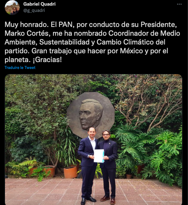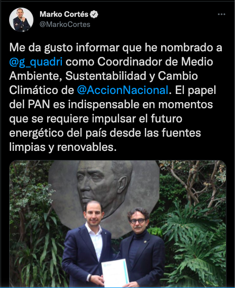 "Me da gusto informar que he nombrado a @g_quadri como Coordinador de Medio Ambiente, Sustentabilidad y Cambio Climático de @AccionNacional. El papel del PAN es indispensable en momentos que se requiere impulsar el futuro energético del país desde las fuentes limpias y renovables", dijo el panista por medio de su cuenta de Twitter.