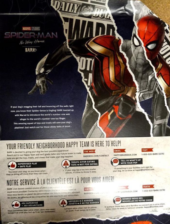 Aunque la imagen más sorprendente es la que nos llega de una promoción de una suscripción de productos para perros llamada Bark con temática de la película, que incluye un nuevo arte protagonizado por el Spider-Man de Tom Holland y uno de sus nuevos trajes junto a imágenes del Daily Bugle y lo que parece ser la máscara del Spider-Man de Tobey Maguire.