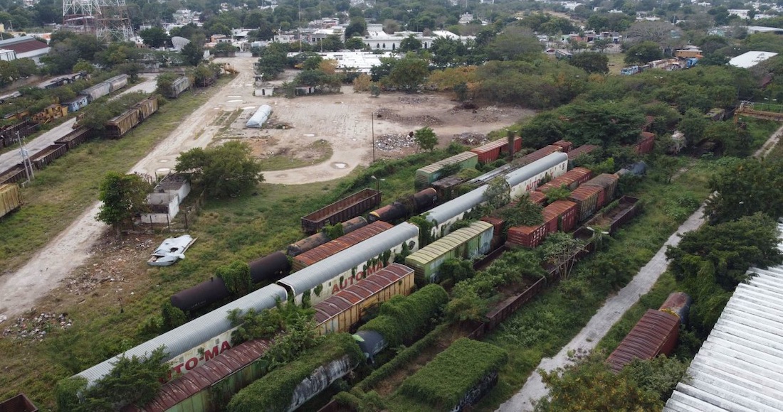 A la entrada de esas oficinas, se observan decenas de durmientes de concreto apilados, así como acopios de rieles de acero retirados del ferrocarril del Istmo de Tehuantepec, los cuales están siendo reutilizados para construir un prototipo de vivienda.