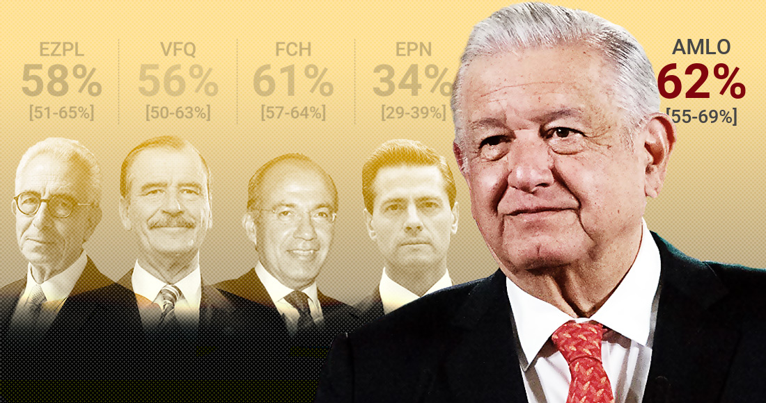 Pérez-Escamilla detalló que en el mismo periodo de su Gobierno, Ernesto Zedillo, Presidente de México de 1994 al 2000, tenía una aceptación del 58 por ciento; Vicente Fox, cuyo mandato fue del 2000 al 2006, del 56 por ciento; Felipe Calderón, de 2006 a 2012, de 61 por ciento; mientras que el expresidente Enrique Peña Nieto, de 2012 a 2018, del 34 por ciento.