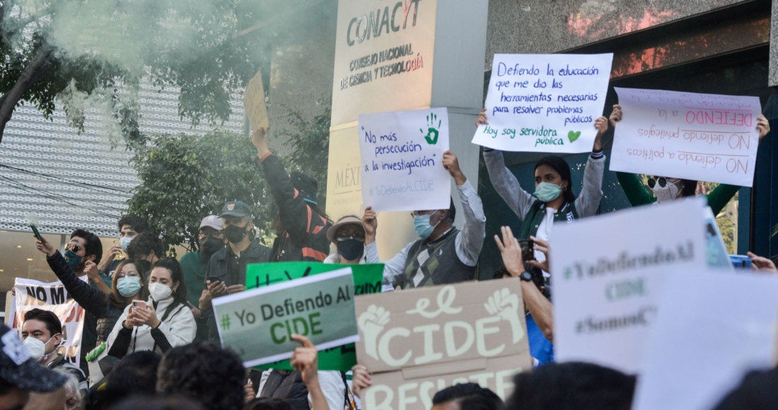 Con pancartas que decían “#YoDefiendoAlCIDE” y “CIDE Resiste”, la comunidad estudiantil llegó a la sede del Conacyt, donde el académico Jean Meyer leyó un posicionamiento en el que acusó al consejo que preside María Elena Álvarez-Buylla de no defender el presupuesto para la ciencia, hacer cambios en el reglamento del Sistema Nacional de Investigadores (SNI), perseguir a científicos mexicanos y restringir becas para estudiantes.