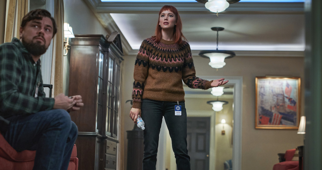 DiCaprio y Lawrence interpretan a dos astrónomos que emprenden una descomunal gira mediática para avisar a la humanidad de la llegada de un cometa que va a destruir la Tierra. "Me encanta la manera en que Adam representó a estos dos personajes tan diferentes. El de Jen [Lawrence] es tremendamente honesto, como una especie de Greta Thunberg, y el mío intenta jugar dentro del sistema", señaló el ganador del Óscar por El renacido.