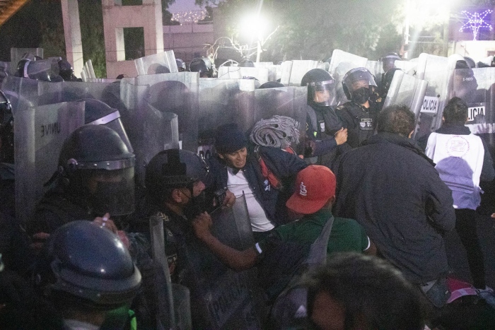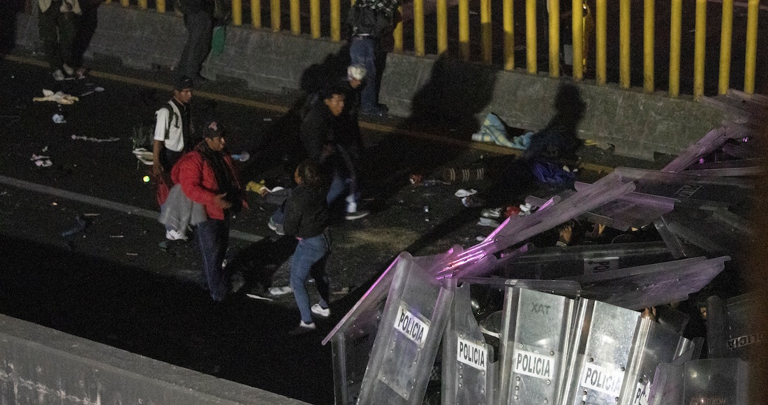 Migrantes se enfrentaron con elementos de la Secretaría de Seguridad Ciudadana, cuando estos últimos les impidieron el paso, ya que pretendían llegar a la Basílica de Guadalupe. Foto: Moisés Pablo, Cuartoscuro.