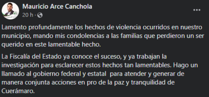 A través de sus redes sociales, Mauricio Arce Canchola, Alcalde de Cuerámaro, lamentó el suceso y envió sus condolencias a las familias de las víctimas mortales.