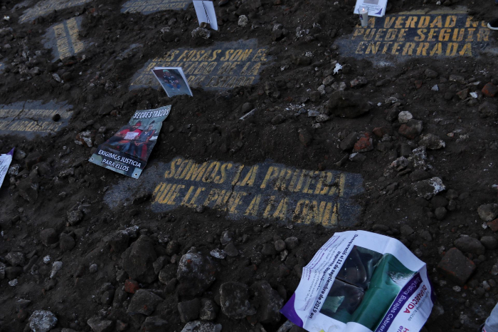 Los familiares, principalmente mujeres, se quejaron de los “oídos sordos” del Gobierno a sus exigencias de justicia. “Buscamos respuestas, buscamos verdad”, clamaron junto a las fosas reconstruidas bajo las que desenterraron lemas pintados previamente en el suelo del Zócalo de la capital con exigencias similares.