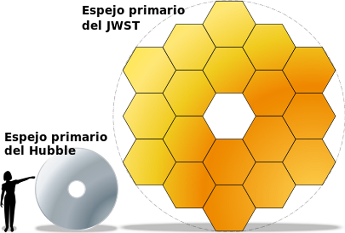 El telescopio James Webb será el más potente hasta la fecha. Dispondrá de un espejo primario de 6.5 metros de diámetro (formado por 18 segmentos hexagonales de berilio, revestidos en oro) y obtendrá imágenes en el rango del infrarrojo.