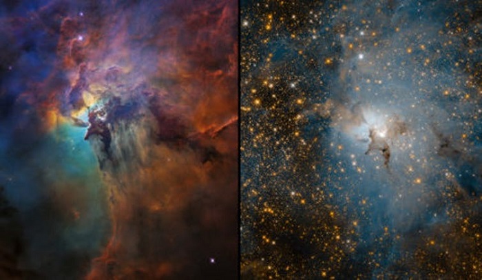 Nebulosa de la Laguna (M8) registrada en el visible (izquiera) e infrarrojo (derecha). Foto: NASA