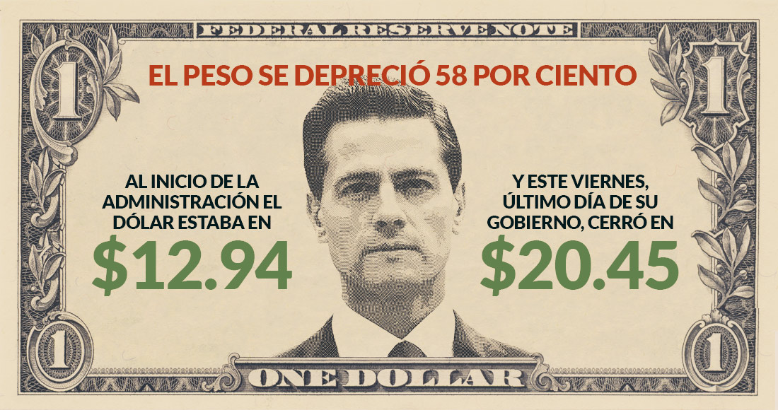 El pasado 17 de diciembre, el Presidente desatacó en su conferencia matutina la recuperación del peso frente al billete verde y mencionó que en lo que va de su administración solo se ha depreciado en 2.8 por ciento la moneda mexicana en comparación con otros sexenios como el de Enrique Peña Nieto (57.39 por ciento), Felipe Calderón Hinojosa (17.54 por ciento), Vicente Fox Quesada (16.74 por ciento), Ernesto Zedillo Ponce de León (169.91 por ciento) y Carlos Salinas de Gortari (52.31 por ciento), como se muestra en la siguiente gráfica.