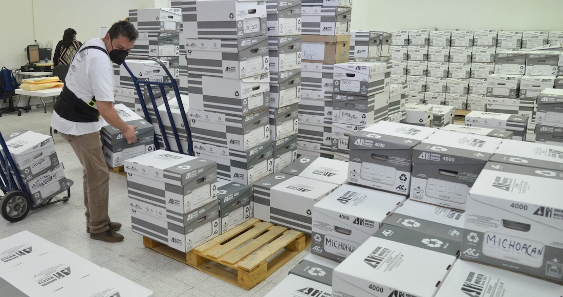 En una bodega del Instituto Nacional Electoral (INE) ubicada en la colonia Mixcoac son resguardadas y revisadas aproximadamente 4 millones apoyos recopilados por "Que siga la democracia AC" para la Revocación de Mandato. Foto: Cuartoscuro