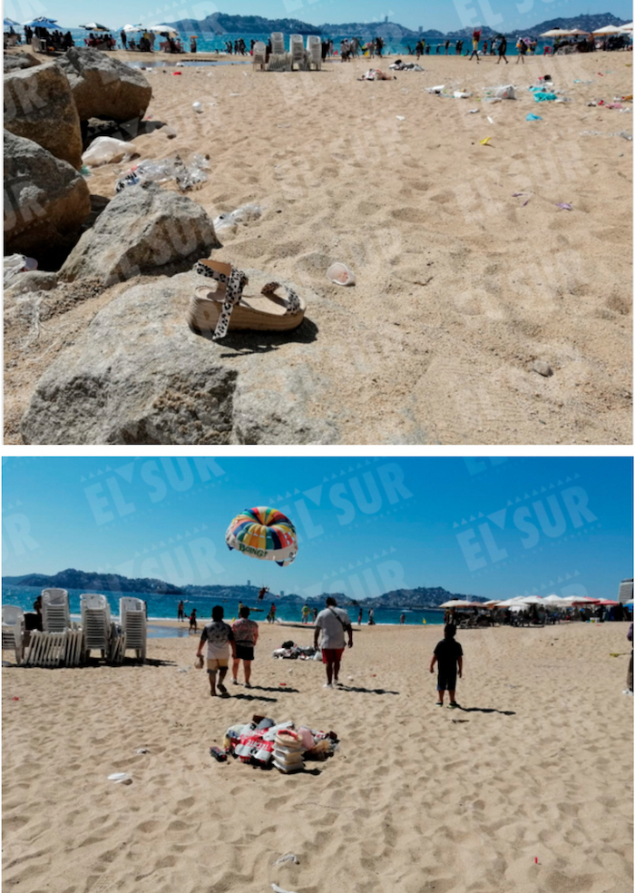 Acapulco, 1 de enero (Sur de Acapulco).- Montones de basura en las diferentes playas de Acapulco, Guerrero, se vieron este primer día de 2022, tras la gala de fuegos artificiales por el festejo de Año Nuevo.