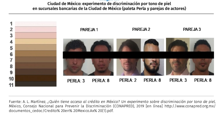 Según un experimento de 2017, citado por el análisis de Conapred y Cepal, realizado con la finalidad de medir el trato diferenciado basado en el tono de la piel en sucursales bancarias de la Ciudad de México. En el experimento participaron tres parejas de actores formadas por un joven mexicano con tono oscuro de piel y otro con tono claro. Cada pareja visitó 100 sucursales bancarias ubicadas en la Ciudad de México, para un total de cerca de 600 visitas a 300 filiales.