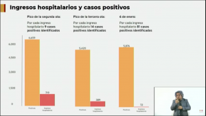 En el pico de la segunda ola, se conocieron alrededor de seis mil 659 casos positivos, "no tan lejos de lo que estamos identificando hoy" y 719 ingresos hospitalarios, lo cual significaba que por cada ingreso hospitalario, habían nueve casos positivos.