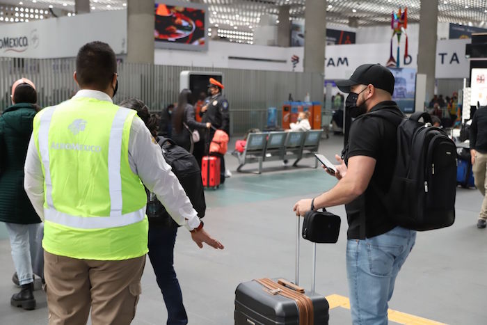 Personal de la Secretaría de Seguridad Ciudadana de la Ciudad de México se encuentra desde ayer en el aeropuerto tratando de mantener el orden y el distanciamiento social en las filas, donde los viajeros se quejan de llevar incluso horas esperando para facturar su equipaje.