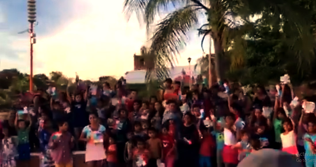 Las imágenes muestran a los hombres encapuchados y portando chalecos antibalas, aunque no se ve la presencia de armas de fuego. Asimismo, se ven cajas de cartón llenas de juguetes rodeadas por jóvenes y niños.