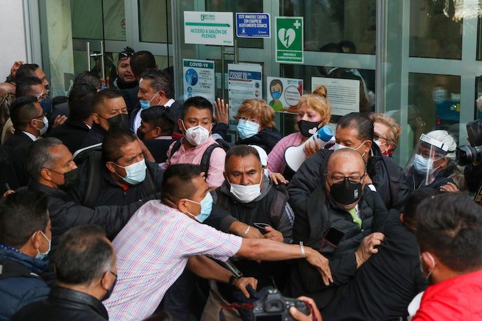 Entre empujones, golpes y agresiones verbales, los inconformes intentaron ingresar al pleno, en donde tomó protesta por un segundo periodo de tres años en la presidencia el Magistrado Rafael Guerra Álvarez.