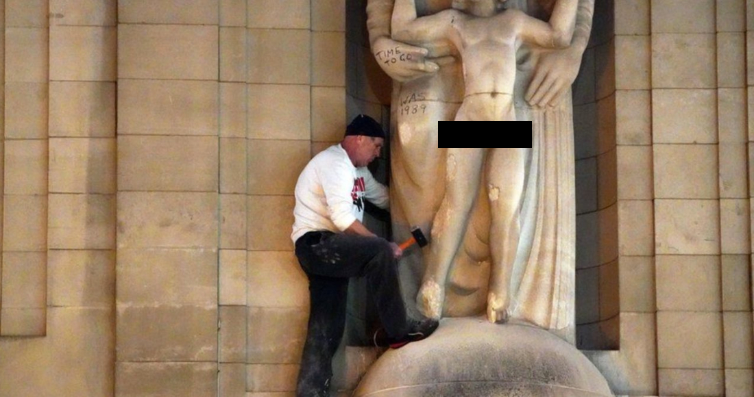 Outside BBC right now a man is trying to smash up Eric Gill statue while another man live streams talking about paedophiles. Gill’s horrific crimes are well known. But is this the way? pic.twitter.com/IzFUBIJfwT