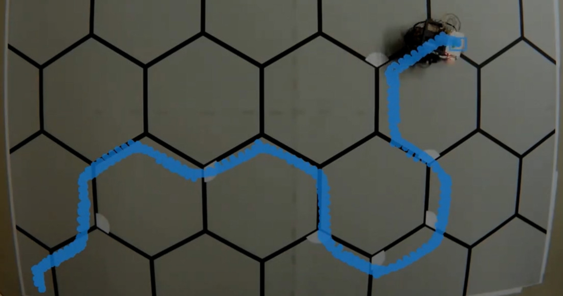 El robot empezó su proceso de aprendizaje a través de un laberinto formado por hexágonos con líneas negras, las cuales se asemejan a un panal.