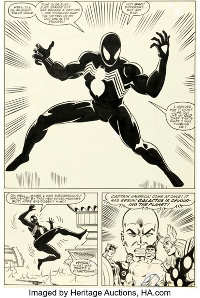 Las ilustraciones de Mike Zeck para la página 25 del cómic Secret Wars número 8 de Marvel Comics muestran la primera aparición de la vestimenta negra de Spider-Man. El traje simbiótico eventualmente daría origen al personaje Venom.