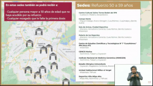 Las sedes para recibir la dosis de refuerzo en la CdMx serán las mismas que para el grupo de 50 a 59 años, que continuarán siendo inoculadas hasta el miércoles 26 de enero: