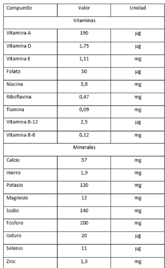 Este alimento presenta un alto contenido de vitaminas y minerales que son esenciales para su salud (Tabla 1). Su incorporación en una dieta balanceada es esencial para reducir el riesgo de muchas patologías y lograr una recuperación adecuada tras la enfermedad.