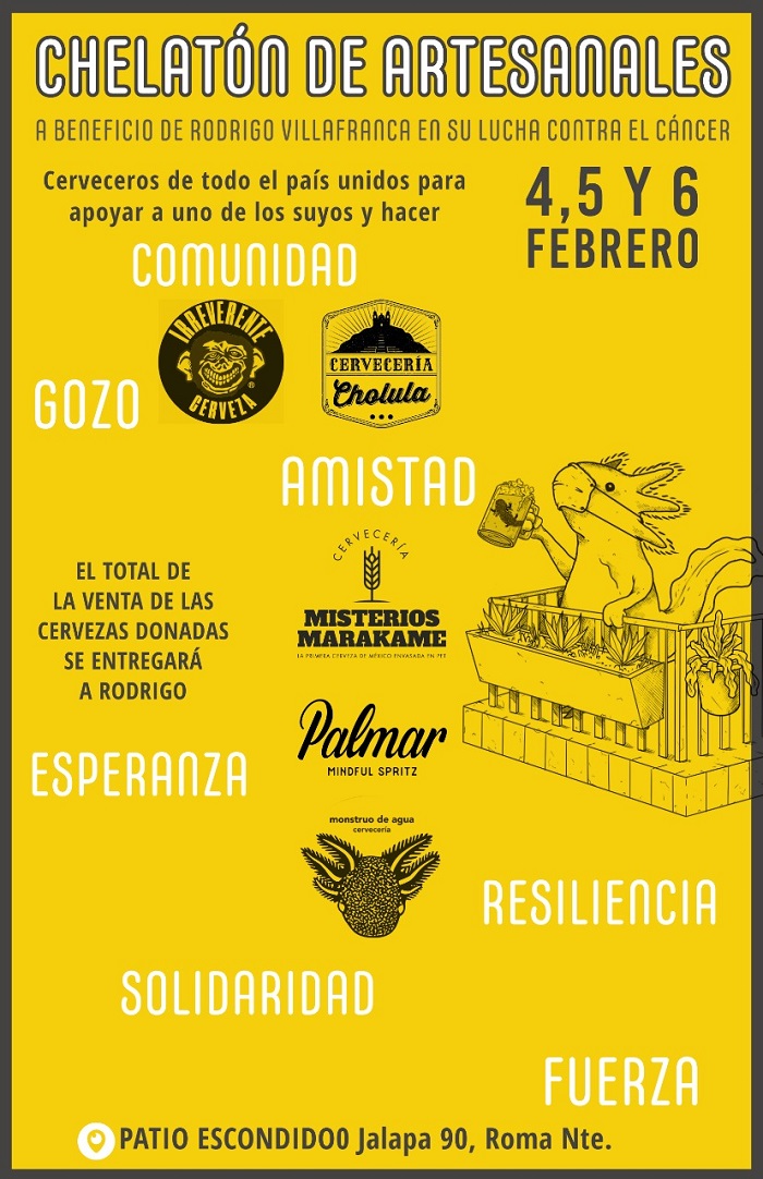 Ciudad de México, 30 de enero (SinEmbargo).-Los próximos 4, 5 y 6 de febrero se realizará el "Chelatón de Artesanales" en Patio Escondido, un evento en el que cervecerías de todo México se unen para recaudar fondos para Rodrigo Villafranca, uno de los fundadores de la Cervecería Monstruo de Agua, todo lo recaudado se usará para pagar el tratamiento médico que necesita en su lucha contra el cáncer.